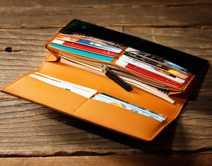 磨き上げたコバと美しいツヤが魅力の小銭入れ付き長財布。