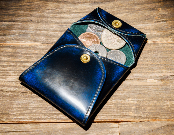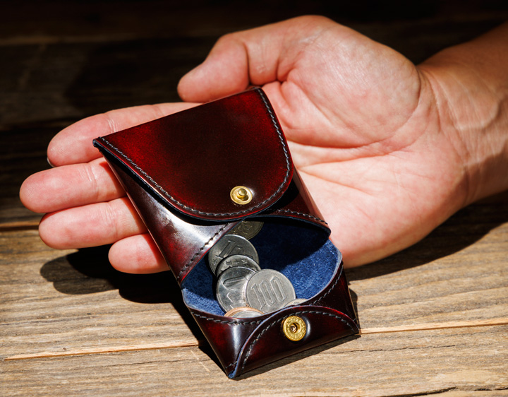 職人の手磨きによる美しいグラデーションが特徴で、使うほどに味わいが増す逸品です。 エナメルのような輝きを持つレザーで、カジュアルなシーンだけでなくビジネスシーンにも映えるデザイン。 内側には柔らかなピッグスエードを使用し、小銭を優しく包み込みます。スナップボタンでしっかりと閉じることができ、ポケットやバッグにもスッキリと収まるサイズ感。普段使いにも、プレゼントにも最適な小銭入れです。