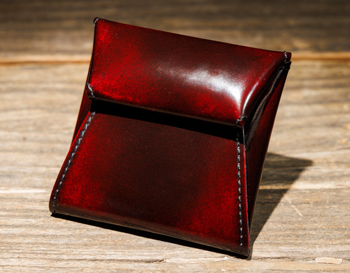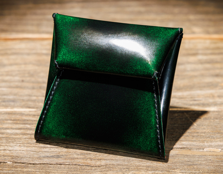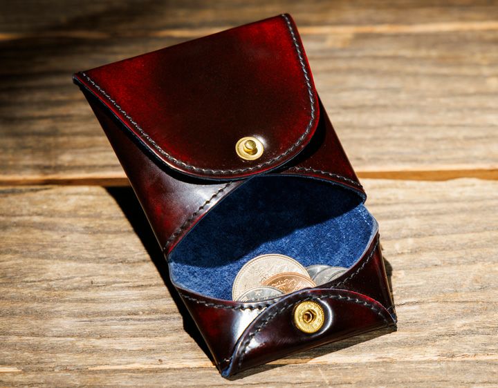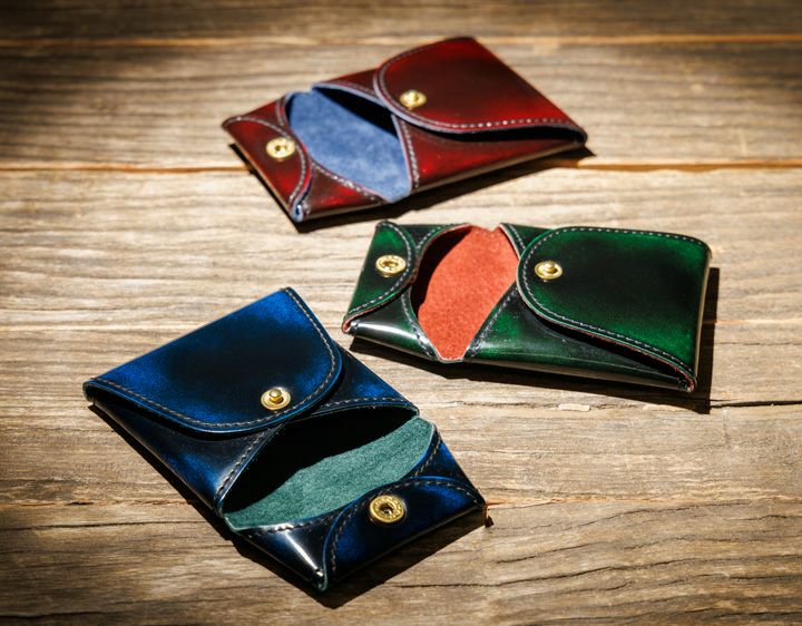 職人の手磨きによる美しいグラデーションが特徴で、使うほどに味わいが増す逸品です。 エナメルのような輝きを持つレザーで、カジュアルなシーンだけでなくビジネスシーンにも映えるデザイン。 内側には柔らかなピッグスエードを使用し、小銭を優しく包み込みます。スナップボタンでしっかりと閉じることができ、ポケットやバッグにもスッキリと収まるサイズ感。普段使いにも、プレゼントにも最適な小銭入れです。