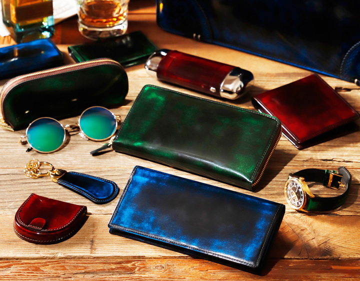 手磨きによるグラデーションと透明感ある艶、そしてキップ革の美しい手触りと細部へのこだわりが魅力です。