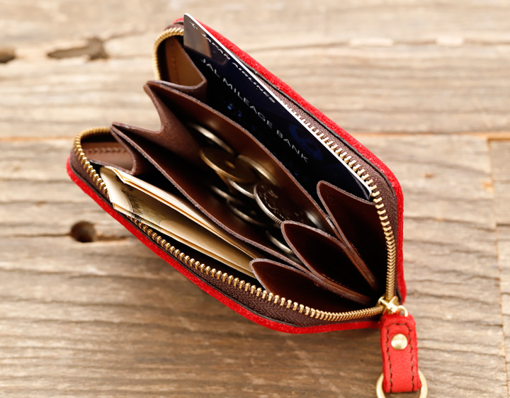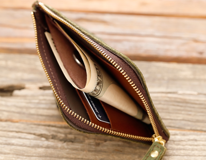 開け閉めしやすいL型ファスナータイプ。お札やカード、小銭入れ、それぞれが見渡せて出し入れしやすい実用的な作りです。